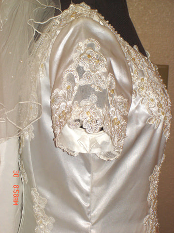 This is a beautiful wedding gown, for a beautiful bride. It has a cathedral train, is embellished, and still has tags.